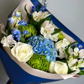 Загадочный и романтичный букет, воплощает в себе таинственность и притягательность. Синие тона, создают атмосферу загадки и привлекают внимание своей уникальной красотой.