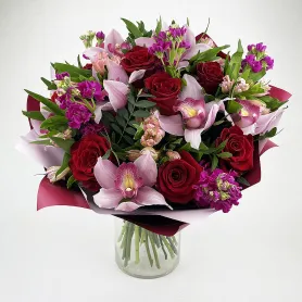 «Бордо» - это изысканный и роскошный букет, в котором преобладает насыщенный бордовый цвет орхидей. Этот букет выглядит элегантно и привлекательно, подчеркивая изысканный вкус и стиль получателя. Орхидеи в букете «Бордо» создают атмосферу роскоши и изысканности, делая его идеальным подарком для особых случаев или для тех, кто ценит изысканность и красоту.