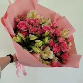 Букет с яркими кустовыми розами, которые как ягодки выделяются на фоне белых альстромерий, прекрасное сочетание, позволяющее выразить трепетные чувства к избраннице