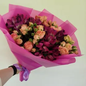Контрастный букет из ярких альстромерий и нежных кустовых роз подарит радость вашей маме или бабушке