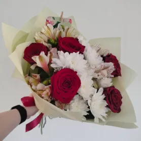 Этот изысканный букет, который сочетает в себе яркие краски и нежность. Красные розы символизируют страсть и любовь, а бело-розовые альстромерии и белые хризантемы добавляют воздушности и лёгкости. Этот букет станет прекрасным подарком на любой праздник или просто знаком внимания для дорогого вам человека.