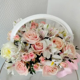 Композиция в корзине «Жемчужинка» - это элегантное и изысканное сочетание цветов и зелени, создающее неповторимую атмосферу роскоши и изысканности. В ней использованы нежные оттенки белого, кремового и персикового, а также легкое дополнение из зелени. Эта композиция идеально подходит для особых мероприятий, подарков или для создания романтического настроения. Она привлекает внимание своей изящностью и нежностью, а розы в корзине добавляют особый шарм и роскошь.