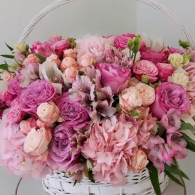 Композиция в корзине «Розовая барби» - это яркий и элегантный ансамбль, состоящий из нежных розовых роз, дополненных изящными зелеными ветками и украшенных лентами.